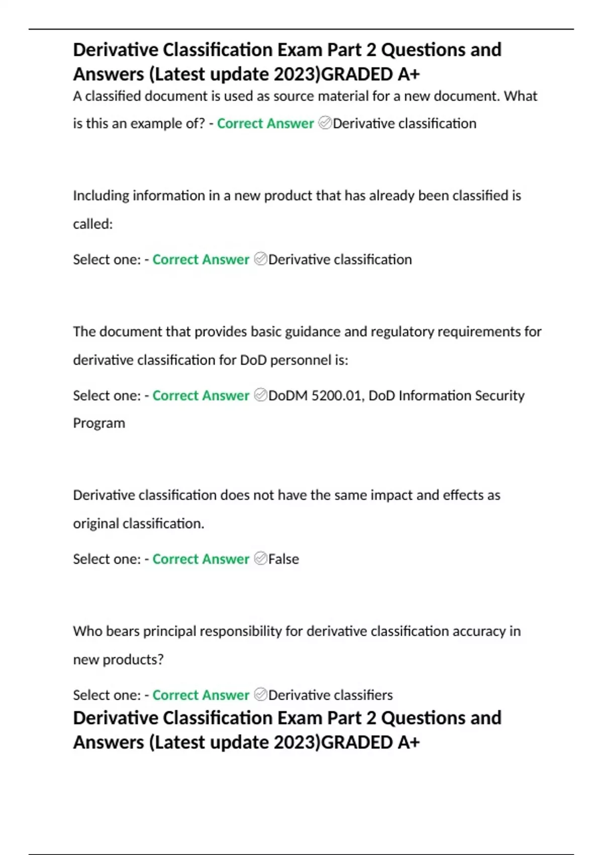 Derivative Classification 2023 Questions & Answers 100 RATED A+ , The steps in the derivative classification process include establishing the proper level of classification of the source document, ensuring proper marking and handling of the.